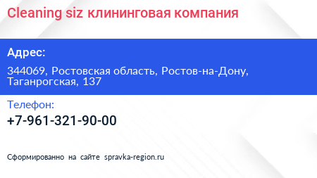 Cleaning siz, клининговая компания по адресу 344069, Ростовская область, Ростов-на-Дону, Таганрогская, 137 в дальнейшем Организация, размещена в следующих категориях: