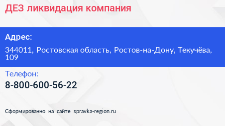 ДЕЗ ликвидация, компания по адресу 344011, Ростовская область, Ростов-на-Дону, Текучёва, 109 в дальнейшем Организация, размещена в следующих категориях: