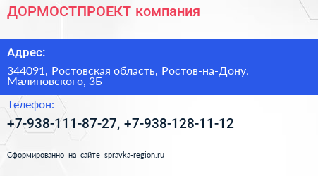 ДОРМОСТПРОЕКТ, компания по адресу 344091, Ростовская область, Ростов-на-Дону, Малиновского, 3Б в дальнейшем Организация, размещена в следующих категориях: