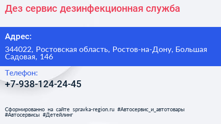 Дез-сервис, дезинфекционная служба по адресу 344022, Ростовская область, Ростов-на-Дону, Большая Садовая, 146 в дальнейшем Организация, размещена в следующих категориях: