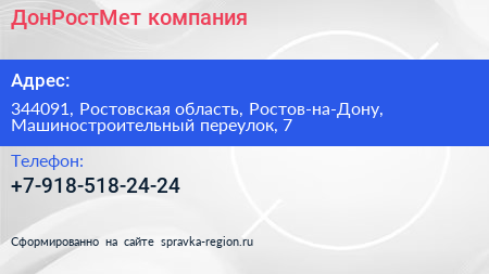ДонРостМет, компания по адресу 344091, Ростовская область, Ростов-на-Дону, Машиностроительный переулок, 7 в дальнейшем Организация, размещена в следующих категориях: