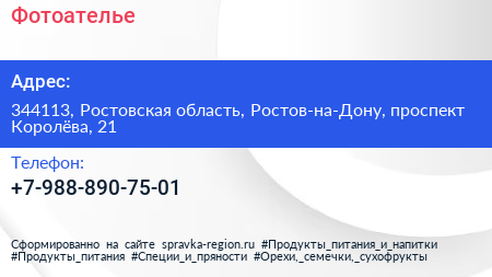 Фотоателье по адресу 344113, Ростовская область, Ростов-на-Дону, проспект Королёва, 21 в дальнейшем Организация, размещена в следующих категориях: