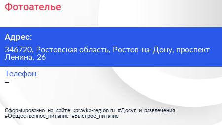 Фотоателье по адресу 346720, Ростовская область, Ростов-на-Дону, проспект Ленина, 26 в дальнейшем Организация, размещена в следующих категориях: