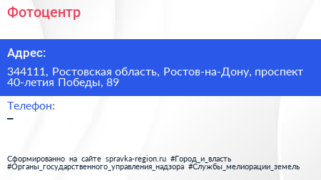Фотоцентр по адресу 344111, Ростовская область, Ростов-на-Дону, проспект 40-летия Победы, 89 в дальнейшем Организация, размещена в следующих категориях: