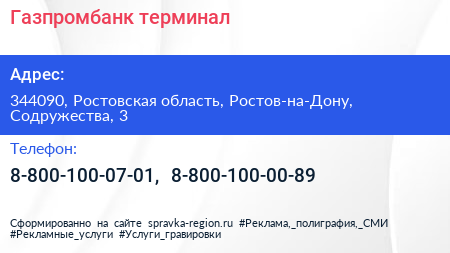 Газпромбанк, терминал по адресу 344090, Ростовская область, Ростов-на-Дону, Содружества, 3 в дальнейшем Организация, размещена в следующих категориях: