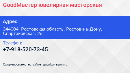 GoodМастер, ювелирная мастерская по адресу 344004, Ростовская область, Ростов-на-Дону, Спартаковская, 26 в дальнейшем Организация, размещена в следующих категориях: