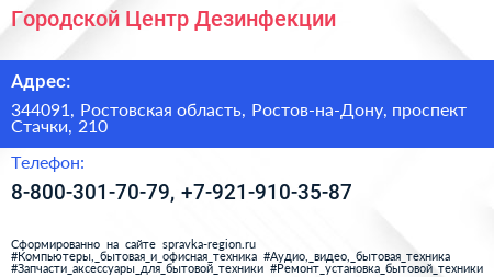 Городской Центр Дезинфекции по адресу 344091, Ростовская область, Ростов-на-Дону, проспект Стачки, 210 в дальнейшем Организация, размещена в следующих категориях: