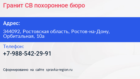 Гранит-СВ, похоронное бюро по адресу 344092, Ростовская область, Ростов-на-Дону, Орбитальная, 10а в дальнейшем Организация, размещена в следующих категориях: