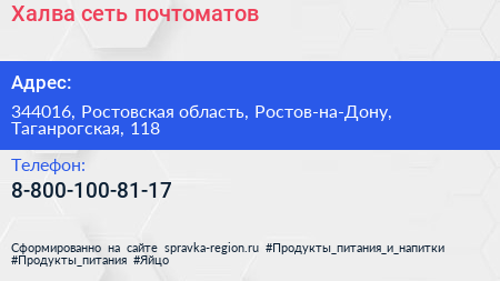 Халва, сеть почтоматов по адресу 344016, Ростовская область, Ростов-на-Дону, Таганрогская, 118 в дальнейшем Организация, размещена в следующих категориях: