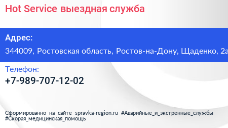 Hot Service, выездная служба по адресу 344009, Ростовская область, Ростов-на-Дону, Щаденко, 2а в дальнейшем Организация, размещена в следующих категориях: