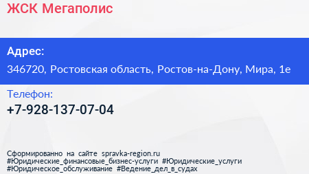 ЖСК Мегаполис по адресу 346720, Ростовская область, Ростов-на-Дону, Мира, 1е в дальнейшем Организация, размещена в следующих категориях:
