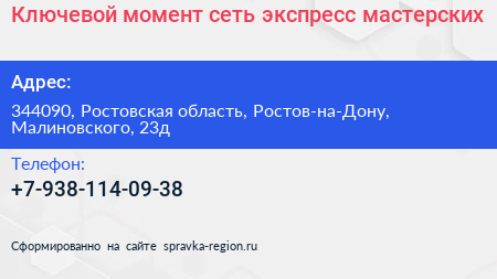 Ключевой момент, сеть экспресс-мастерских по адресу 344090, Ростовская область, Ростов-на-Дону, Малиновского, 23д в дальнейшем Организация, размещена в следующих категориях: