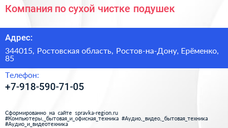 Компания по сухой чистке подушек по адресу 344015, Ростовская область, Ростов-на-Дону, Ерёменко, 85 в дальнейшем Организация, размещена в следующих категориях: