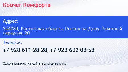 Ковчег Комфорта по адресу 344034, Ростовская область, Ростов-на-Дону, Ракетный переулок, 20 в дальнейшем Организация, размещена в следующих категориях: