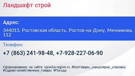 Ландшафт-строй по адресу 344013, Ростовская область, Ростов-на-Дону, Мечникова, 112 в дальнейшем Организация, размещена в следующих категориях: