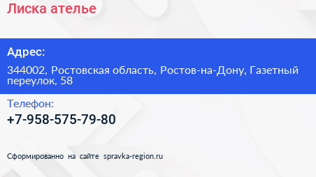Лиска, ателье по адресу 344002, Ростовская область, Ростов-на-Дону, Газетный переулок, 58 в дальнейшем Организация, размещена в следующих категориях: