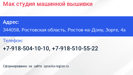 Мак, студия машинной вышивки по адресу 344058, Ростовская область, Ростов-на-Дону, Зорге, 4а в дальнейшем Организация, размещена в следующих категориях: