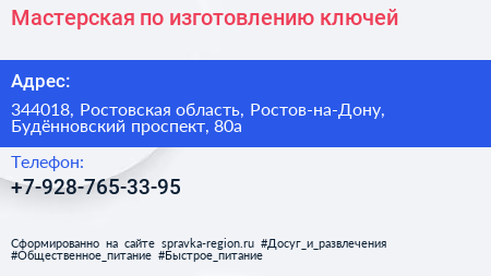 Мастерская по изготовлению ключей по адресу 344018, Ростовская область, Ростов-на-Дону, Будённовский проспект, 80а в дальнейшем Организация, размещена в следующих категориях: