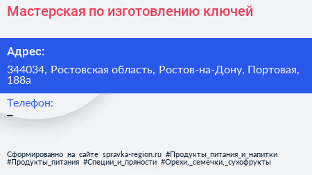 Мастерская по изготовлению ключей по адресу 344034, Ростовская область, Ростов-на-Дону, Портовая, 188а в дальнейшем Организация, размещена в следующих категориях: