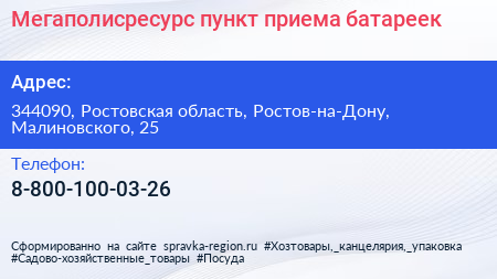 Мегаполисресурс, пункт приема батареек по адресу 344090, Ростовская область, Ростов-на-Дону, Малиновского, 25 в дальнейшем Организация, размещена в следующих категориях: