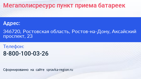 Мегаполисресурс, пункт приема батареек по адресу 346720, Ростовская область, Ростов-на-Дону, Аксайский проспект, 23 в дальнейшем Организация, размещена в следующих категориях: