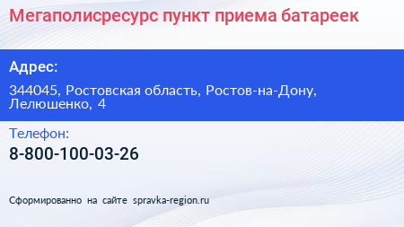 Мегаполисресурс, пункт приема батареек по адресу 344045, Ростовская область, Ростов-на-Дону, Лелюшенко, 4 в дальнейшем Организация, размещена в следующих категориях: