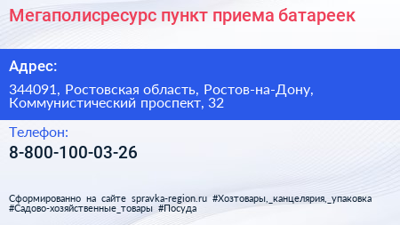 Мегаполисресурс, пункт приема батареек по адресу 344091, Ростовская область, Ростов-на-Дону, Коммунистический проспект, 32 в дальнейшем Организация, размещена в следующих категориях: