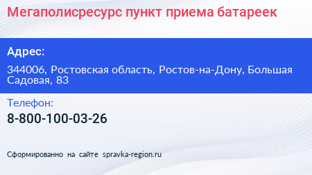 Мегаполисресурс, пункт приема батареек по адресу 344006, Ростовская область, Ростов-на-Дону, Большая Садовая, 83 в дальнейшем Организация, размещена в следующих категориях: