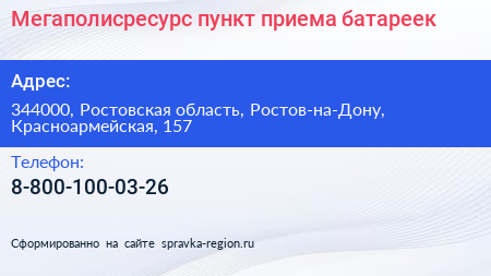 Мегаполисресурс, пункт приема батареек по адресу 344000, Ростовская область, Ростов-на-Дону, Красноармейская, 157 в дальнейшем Организация, размещена в следующих категориях: