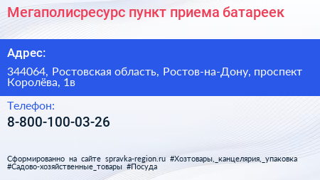 Мегаполисресурс, пункт приема батареек по адресу 344064, Ростовская область, Ростов-на-Дону, проспект Королёва, 1в в дальнейшем Организация, размещена в следующих категориях: