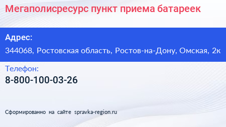 Мегаполисресурс, пункт приема батареек по адресу 344068, Ростовская область, Ростов-на-Дону, Омская, 2к в дальнейшем Организация, размещена в следующих категориях: