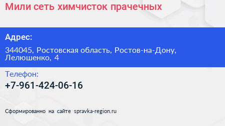 Мили, сеть химчисток-прачечных по адресу 344045, Ростовская область, Ростов-на-Дону, Лелюшенко, 4 в дальнейшем Организация, размещена в следующих категориях: