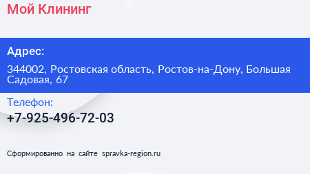 Мой Клининг по адресу 344002, Ростовская область, Ростов-на-Дону, Большая Садовая, 67 в дальнейшем Организация, размещена в следующих категориях: