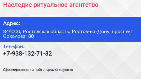 Наследие, ритуальное агентство по адресу 344000, Ростовская область, Ростов-на-Дону, проспект Соколова, 80 в дальнейшем Организация, размещена в следующих категориях: