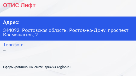 ОТИС Лифт по адресу 344092, Ростовская область, Ростов-на-Дону, проспект Космонавтов, 2 в дальнейшем Организация, размещена в следующих категориях: