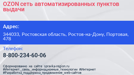 OZON, сеть автоматизированных пунктов выдачи по адресу 344033, Ростовская область, Ростов-на-Дону, Портовая, 478 в дальнейшем Организация, размещена в следующих категориях: