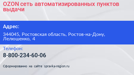 OZON, сеть автоматизированных пунктов выдачи по адресу 344045, Ростовская область, Ростов-на-Дону, Лелюшенко, 4 в дальнейшем Организация, размещена в следующих категориях: