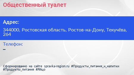 Общественный туалет по адресу 344000, Ростовская область, Ростов-на-Дону, Текучёва, 264 в дальнейшем Организация, размещена в следующих категориях: