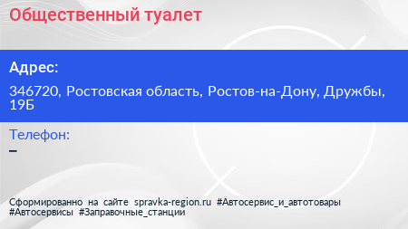 Общественный туалет по адресу 346720, Ростовская область, Ростов-на-Дону, Дружбы, 19Б в дальнейшем Организация, размещена в следующих категориях: