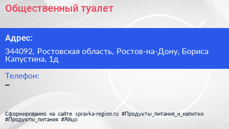 Общественный туалет по адресу 344092, Ростовская область, Ростов-на-Дону, Бориса Капустина, 1д в дальнейшем Организация, размещена в следующих категориях: