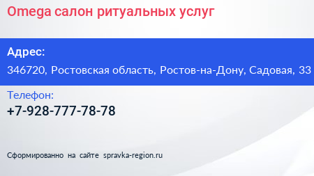 Omega, салон ритуальных услуг по адресу 346720, Ростовская область, Ростов-на-Дону, Садовая, 33 в дальнейшем Организация, размещена в следующих категориях: