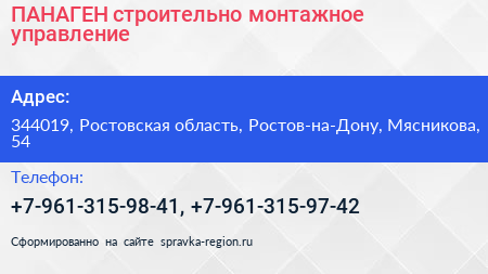 ПАНАГЕН, строительно-монтажное управление по адресу 344019, Ростовская область, Ростов-на-Дону, Мясникова, 54 в дальнейшем Организация, размещена в следующих категориях: