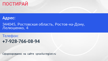 ПОСТИРАЙ по адресу 344045, Ростовская область, Ростов-на-Дону, Лелюшенко, 4 в дальнейшем Организация, размещена в следующих категориях: