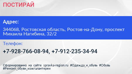 ПОСТИРАЙ по адресу 344068, Ростовская область, Ростов-на-Дону, проспект Михаила Нагибина, 32/2 в дальнейшем Организация, размещена в следующих категориях: