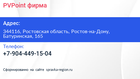 PVPoint, фирма по адресу 344116, Ростовская область, Ростов-на-Дону, Батуринская, 165 в дальнейшем Организация, размещена в следующих категориях: