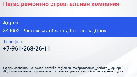 Пегас, ремонтно-строительная компания по адресу 344002, Ростовская область, Ростов-на-Дону, в дальнейшем Организация, размещена в следующих категориях: