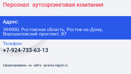 Персонал+, аутсорсинговая компания по адресу 344000, Ростовская область, Ростов-на-Дону, Ворошиловский проспект, 87 в дальнейшем Организация, размещена в следующих категориях: