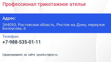 Профессионал, трикотажное ателье по адресу 344010, Ростовская область, Ростов-на-Дону, переулок Белоусова, 6 в дальнейшем Организация, размещена в следующих категориях: