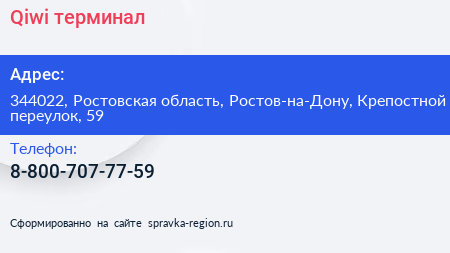 Qiwi, терминал по адресу 344022, Ростовская область, Ростов-на-Дону, Крепостной переулок, 59 в дальнейшем Организация, размещена в следующих категориях: