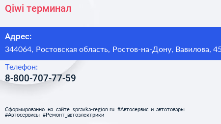 Qiwi, терминал по адресу 344064, Ростовская область, Ростов-на-Дону, Вавилова, 45 в дальнейшем Организация, размещена в следующих категориях: